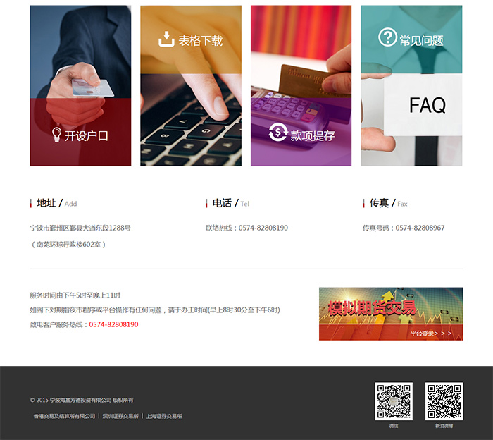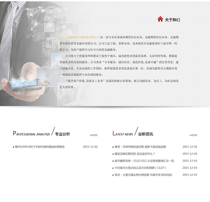 是一家专业从事商品期货经纪业务、金融期货经纪业务、金融期货全面结算等金融业务的公司。公司立足宁波,着眼未来,是香港英皇金融集团在宁波市唯一代理公司,为客户提供全方位全天候的金融服务。
