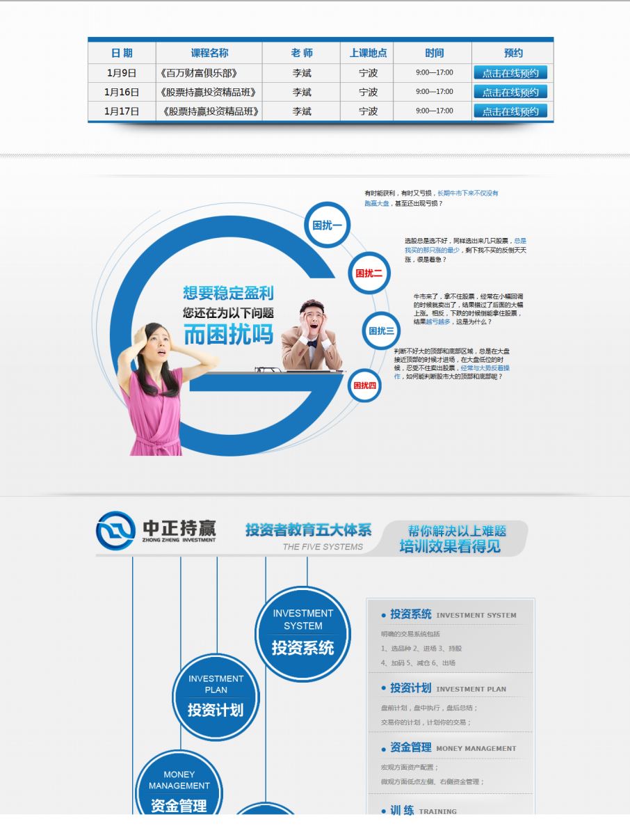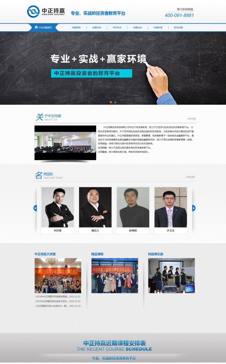 我们的主要课程有:《股票持赢投资精品班》《投资实战技术综合班》《价值投资研修班》