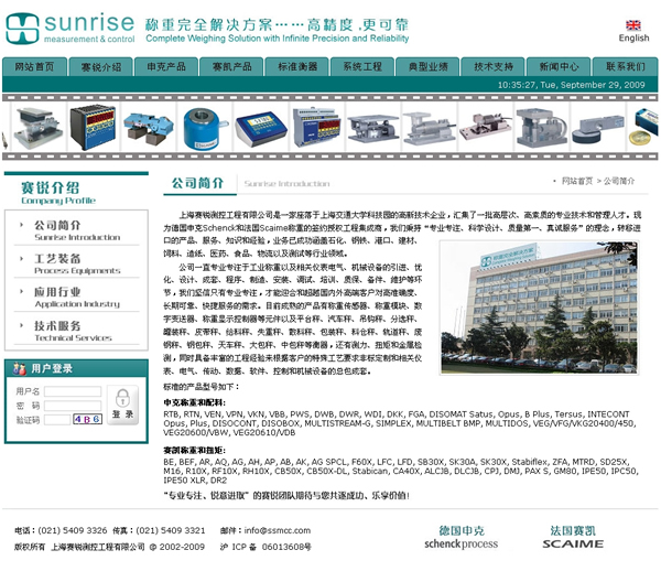 SSMCC 上海赛锐测控工程有限公司创立于2002 年,经过十年来的快速成长和发展,现为德国申克Schenck、赛多利斯Sartorius 和法国世感Scaime称重的签约授权工程商,拥有先进的机械制造、电气成套设备和车间,能为客户提供专业化、个性化、全方位、最直接的产品和应用。在“技术型进口称重设备”企业方针的指引下,我们秉持“专注称重、设计严谨、做工精细、服务至诚”的工作理念,转移世界一流的产品、集成相关配套的电气和机械,分享精确、稳定和可靠的经验,平衡设备投资与生产效率的价值。目前我们已经非常成熟的产品和应用有称重传感器、称重模块、数字变送器、称重显示控制器等元件以及平台秤、汽车秤、吊钩秤、分选秤、罐装秤、皮带秤、给料秤、失重秤、散料秤、包装秤、称重配料系统、料仓秤、轨道秤、废钢秤、钢包秤、天车秤、大包秤、中包秤等衡器,还有测力、扭矩和金属检测等行业产品,同时具备丰富的工程经验来根据客户的特殊工艺要求非标定制和相关仪表、电气、传动、数据、软件、控制和机械设备的总包成套。未来,我们将不断努力,提供更精确的、可靠的、环保的、高性价比的产品与服务。
